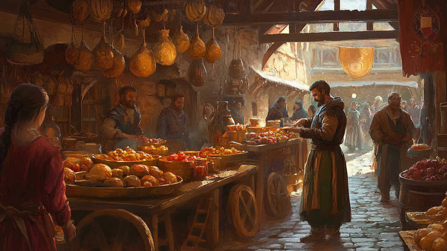 After having set up your stall about two hours ago, you’ve been patiently wait for any potential customers to show interest. After checking your mead keg, and going to stir your slop cauldron, you double take in excitement. Two figures standing in front of your stall. One, a large man with a welcoming smile.