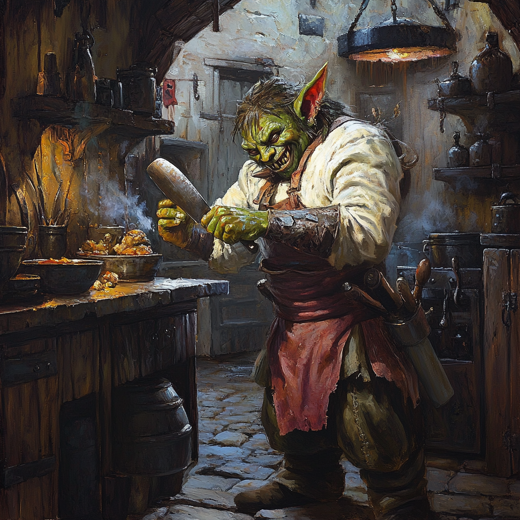 You were once a well respected guild cook in the busy markets of The Mirage. Born into the Snaggletooth clan, a family known for their culinary traditions, you inherited an exceptional sense of taste and smell that set you apart from your peers. From a young age, you showed a natural talent for combining unlikely ingredients into surprisingly delectable concoctions. For fifteen years, you served as the head cook for the Shimmernail Guild, a modestly successful trading collective that specialized in exotic spices and rare ingredients. Your signature dish became something of a legend among guild members and locals alike. A hearty, bubbling stew, that eventually became coloquially known as “Slop”. Many gathered over the years to enjoy your cuisine, yet, none ever came to realise that the secret lay not in the stew itself, but in your special fermented mead, that you both cooked with and served alongside the meal. However, your rising popularity would soon become your downfall. The guild’s leadership, primarily concerned with profits, attempted to force you to reveal your secret recipe so that they could mass produce Slop to sell throughout The Mirage. You refused, claiming that your culinary arts were meant to be experienced freshly made, rather than bottled and commodified. Infuriated at your lack of cooperation, the guild leaders mocked you publically, calling your principles “foolish”, and your food “just soup and beer” that any goblin could make. Deeply insulted, and with your culinary reputation in tatters among the guild elites, you decided to leave the Shimmernail behind. Taking only your cooking implements, spice collection, and your trusty brewing equipment, you set out to prove that your cooking wasn’t in fact just soup and beer that any goblin could make. You knew the difference in your heart and you wanted to show that to the world. To enlighten those around you to the beauty of slop and mead. Over the past two years, you traveled extensively – first upwards through The Mirage’s various settlements, then following trade routes along the icy coast of the Frozen Highlands. Along the way, you set up temporary food stalls in countless marketplaces, offering slop and mead to anyone willing to try it. Your energetic personality and passionate (if sometimes long-winded) explanations of your cooking techniques made you a memorable character in many ports, mainly due to your enthusiasm often exceeding the patience of your audience. In many markets, particularly those you visited multiple times, locals began to roll their eyes when they saw you approach with your portable cooking station. “Here comes the goblin with his slop sermon again,” they’d say, rudely declining your latest culinary innovations. Recently, you parted from the harbour of Snøhaven in the Frozen Highlands, embarking across the vast cold ocean in search of new culinary horizons. You’ve since just arrived in Breisken. Here, amidst the cosmopolitan mix of travellers and locals, you have been hoping to finally find some souls that will share the passion for slop and mead that you do.